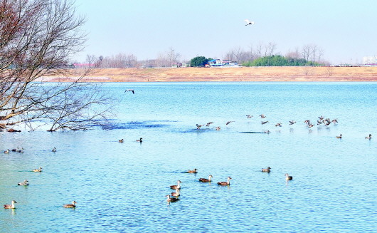 1月11日,白鹭、野鸭等水鸟在淠河国家湿地公园金安区城北镇段飞舞、觅食、游弋,给冬日的淠河湿地公园增添了些许趣味和灵动。